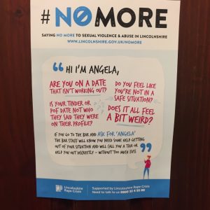‘Pregunta  por Ángela’ nació como una iniciativa del condado de Lincolnshire (Inglaterra)  dentro del programa #NoMore, una campaña más amplia contra el abuso y el acoso sexual en los pubs ingleses.  En ellos un cartel en el baño de las chicas ofrecía la salida para una situación así. Acércate al camarero  y pregúntale por Ángela. Él te ayudará discretamente, llamará a un taxi o te facilitará la forma de salir de allí.